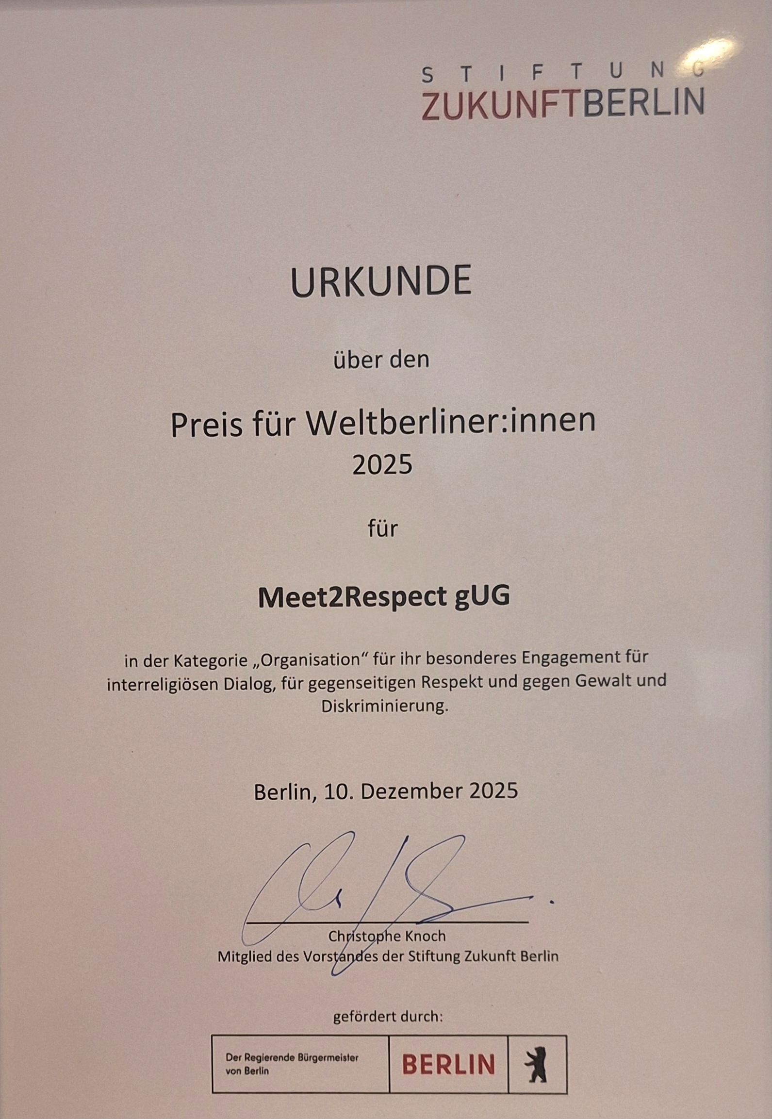 meet2respect wurde von der Stiftung Zukunft Berlin mit dem Preis „Weltberliner:innen“ 2025 ausgezeichnet. Die Auszeichnung erfolgte in der Kategorie Organisation und würdigt unser besonderes Engagement für den interreligiösen Dialog, für gegenseitigen Respekt sowie unseren Einsatz gegen Gewalt und Diskriminierung.